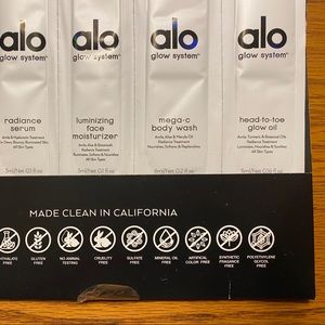 Shipped with USPS message me with questions- all sales final This is a sample set. Alo Glow System Sample Set Cleanser Serum Moisturizer Body Wash Glow Oil.